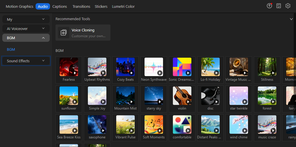 • Built-in massive situational Sound Effects (e.g., ambient sounds, UI sounds, funny noises), available on-demand to perfect video details.